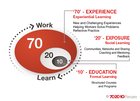 The 70:20:10 Model for Learning and Development has been found to be most effective within the training profession to describe the optimal sources of learning aimed at developing work based competencies. It holds that individuals obtain 70 percent of their knowledge from job-related experiences, 20 percent from interactions with others, and 10 percent from formal educational events.